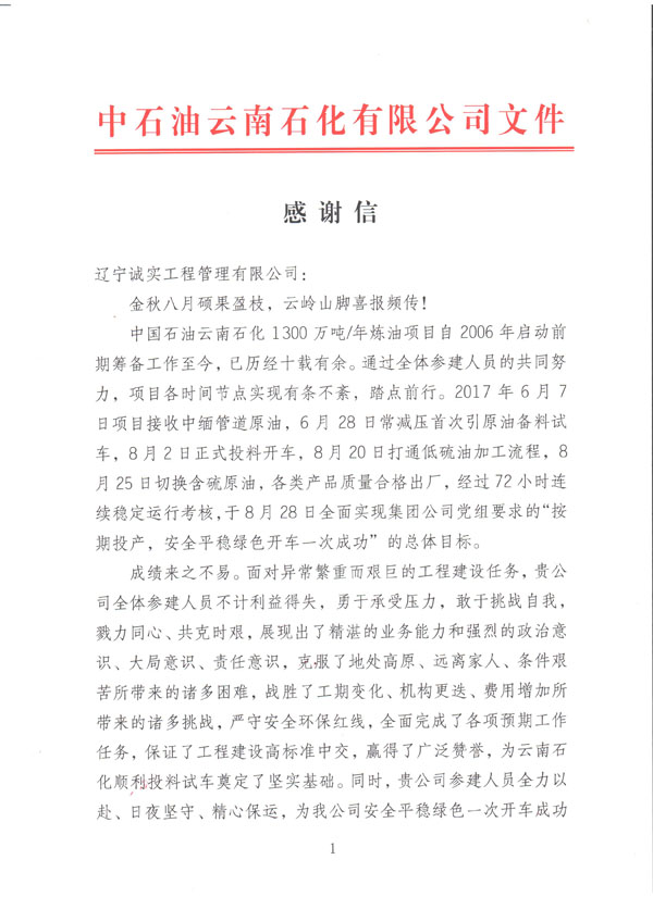 我公司于今日收到由中國石油云南石化有限公司發給我方的《感謝信》一封,信中提到:對于我方所監理服務的煉油項目自2006年啟動籌備工作至今,我方監理人員不計利益得失,勇于承受壓力,使得該項目近日順利投產試車成功。對于我單位的工作給予極大的肯定以及衷心的感謝。對方還提到:希望雙方在日后的共同發展中,互惠互利,共贏發展。