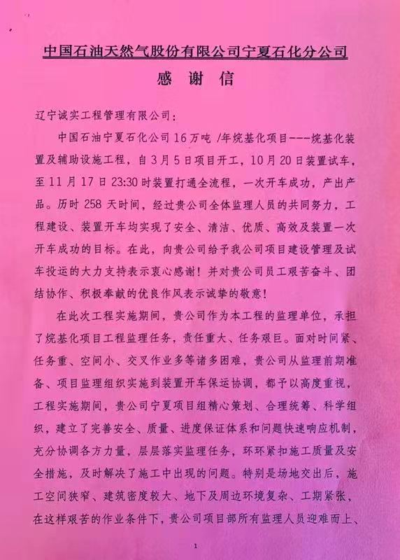信中,中國石油天然氣股份有限公司寧夏石化分公司對我公司及項目監理人員的工作十分滿意,給予了很高的評價與肯定,并表示衷心的感謝。