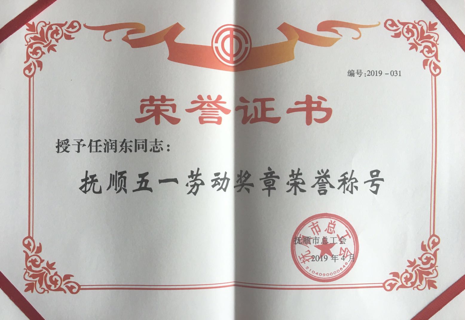 熱烈慶祝我單位任潤東、郭建偉兩位同志榮獲“撫順五一勞動獎章”榮譽稱號