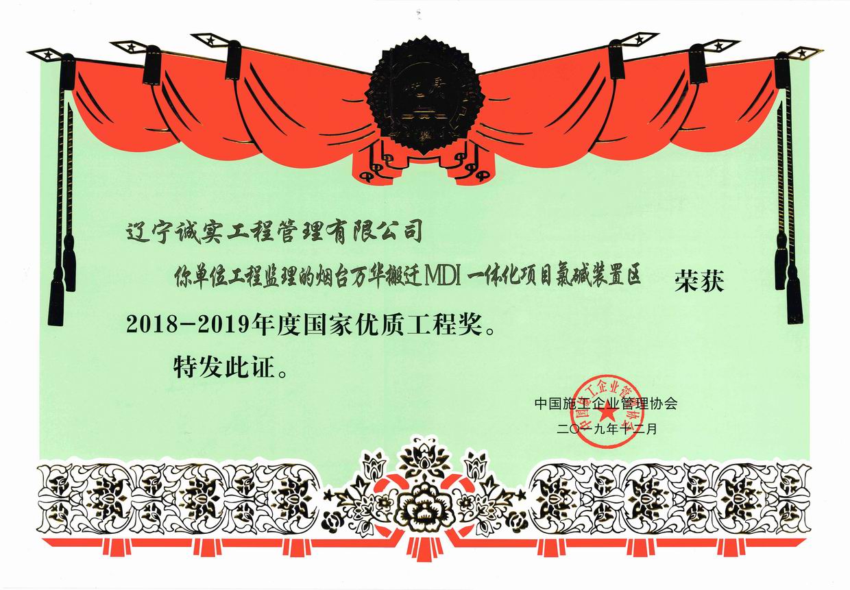 2019年12月,我單位所監理的“煙臺萬華搬遷MDI一體化項目氯堿裝置區”被評為2018-2019年度國家優質工程獎、“中國石油-沙特阿美合資云南1300萬噸/年煉油項目”被評為2018-2019年度國家優質工程金獎。