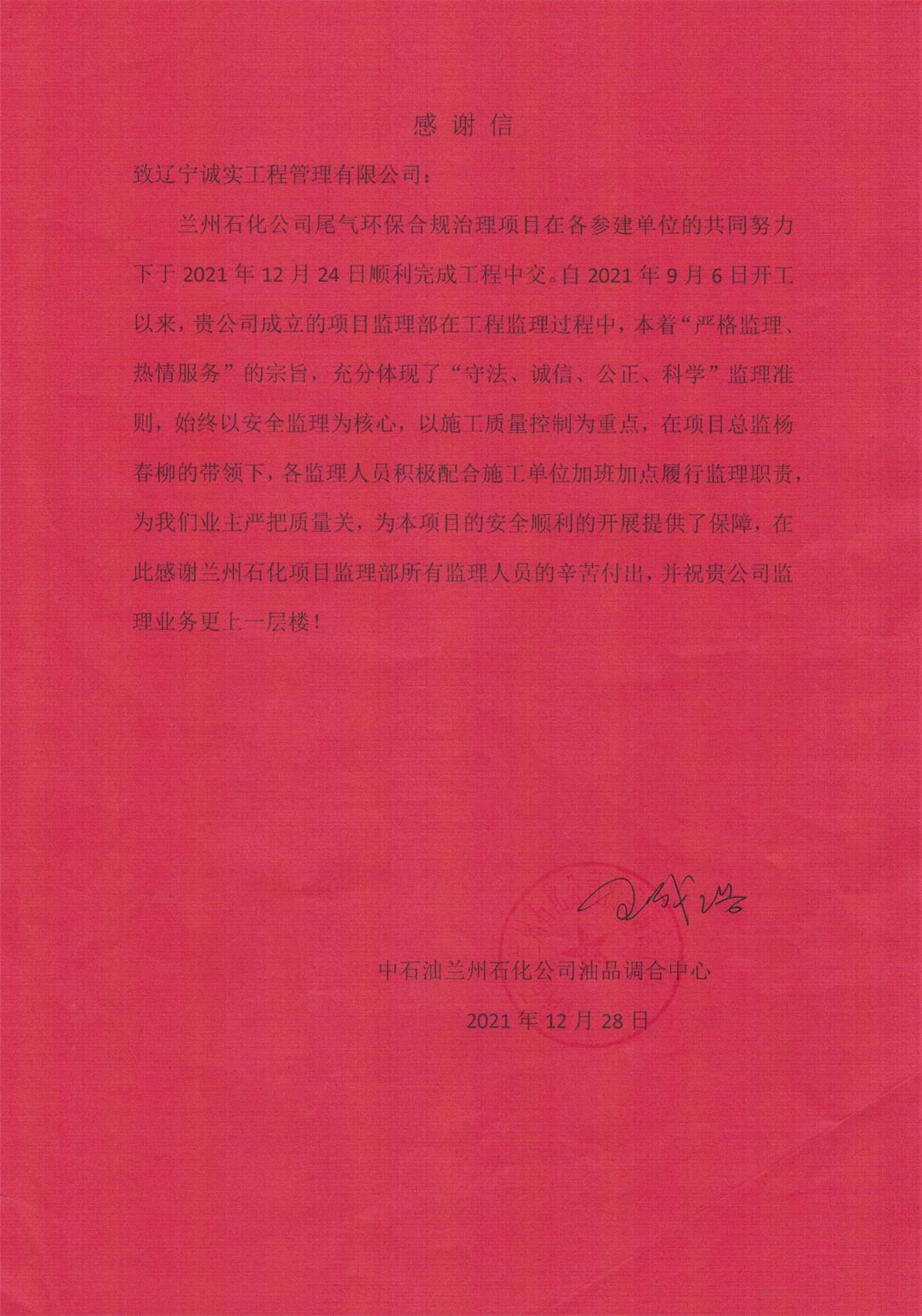 12月28日,蘭州項目監理部收到中石油蘭州石化公司油品調合中心發來的感謝信。信中,業主單位對項目部全體監理人員在項目開展過程中的工作表現給予了充分的肯定和高度的贊譽。這是對我公司卓越的項目管理水平和強大的人才隊伍的最好見證,同時也完美的展現了我們一貫以來“敢打硬仗、善打難仗、能打勝仗”的優良傳統和作風。希望各項目部要以此為動力,不忘初心,牢記使命,擔當作為,為樹立誠實品牌、打造誠實形象再立新功!