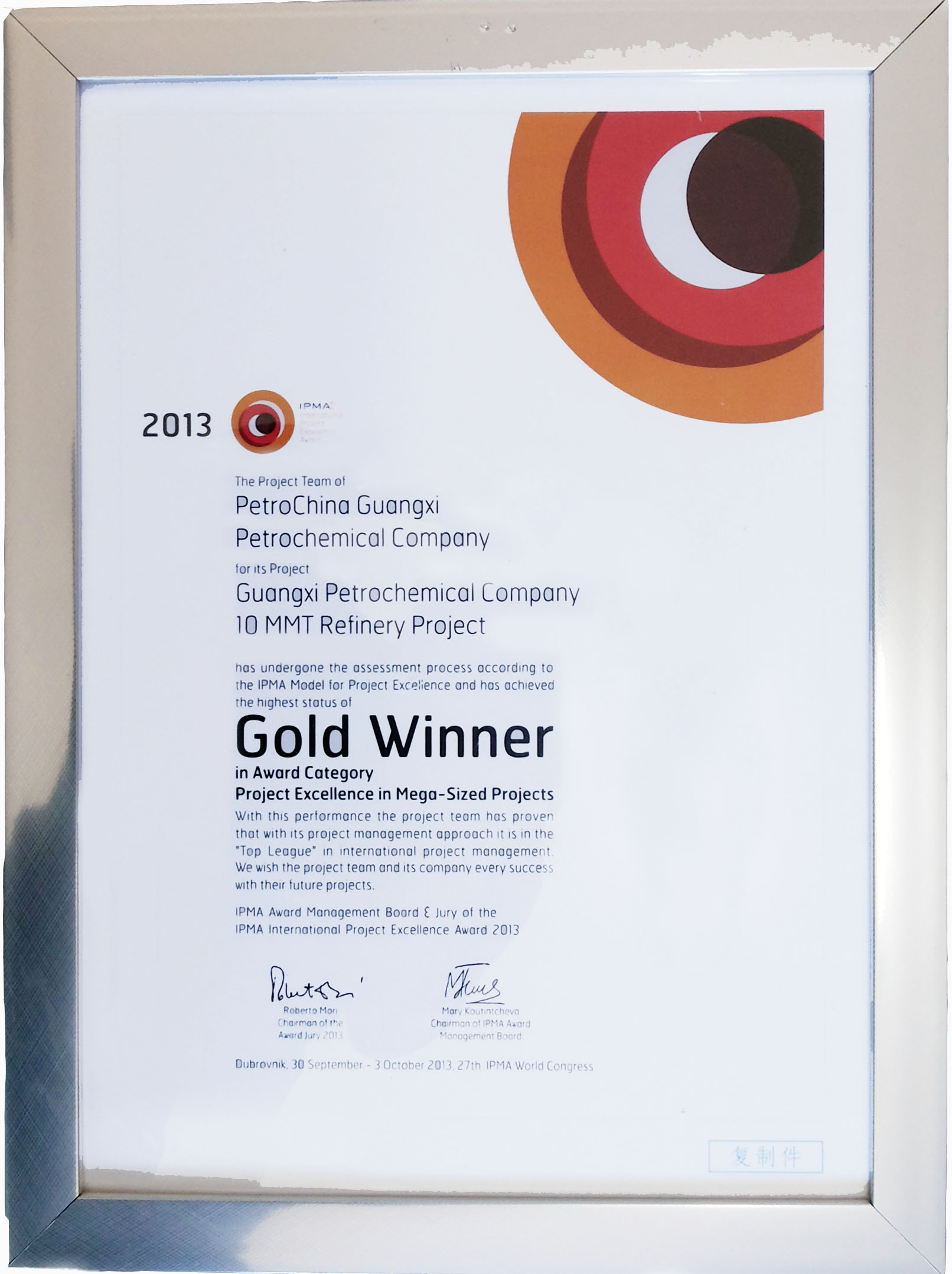 10月2日,從克羅地亞杜布羅夫尼克傳來(lái)一個(gè)令人振奮的消息,在當(dāng)?shù)嘏e行的第27屆IPMA國(guó)際項(xiàng)目管理大會(huì)上,我公司監(jiān)理的廣西石化千萬(wàn)噸煉油項(xiàng)目以最高得分,從澳大利亞海水淡化項(xiàng)目、印度HPCL—MITTAL能源公司GGS煉油項(xiàng)目等14個(gè)入圍項(xiàng)目中脫穎而出,榮獲了IPMA國(guó)際卓越項(xiàng)目管理最高獎(jiǎng)項(xiàng)—特大型項(xiàng)目金獎(jiǎng)。這是繼神舟六號(hào)載人飛船項(xiàng)目(2006,第20屆)、中海油惠州煉油項(xiàng)目(2010,第24屆)之后,中國(guó)第3個(gè)獲此殊榮的特大型項(xiàng)目。