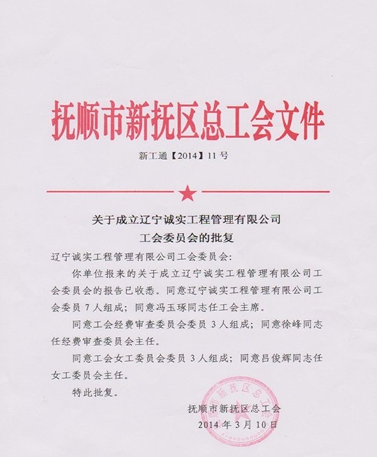 經過近兩個月的籌備,誠實工會現已履行完畢各個籌備程序,撫順市新撫區總工會已正式批準成立遼寧誠實工程管理有限公司工會委員會。公司工會由7名委員組成,下設經費審查委員會和女工委員會。公司工會將根據機關及項目部的實際情況,相應成立工會分會和工會小組,發揮工會在企業中的積極作用,為企業的發展做出貢獻。