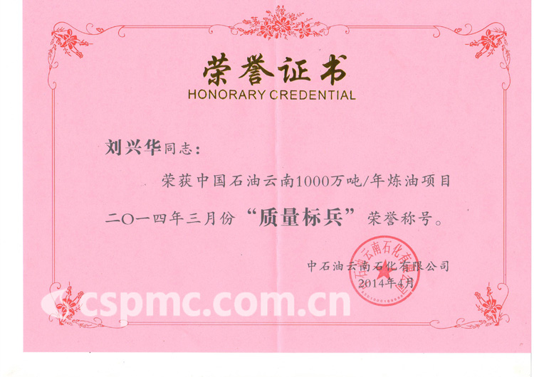 劉興華同志榮獲中國石油云南1000萬噸/年煉油項目2014年3月份“質量標兵”榮譽稱號